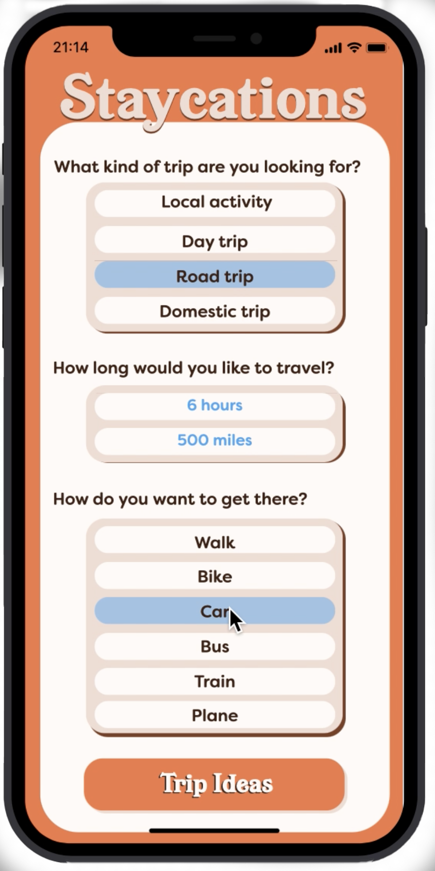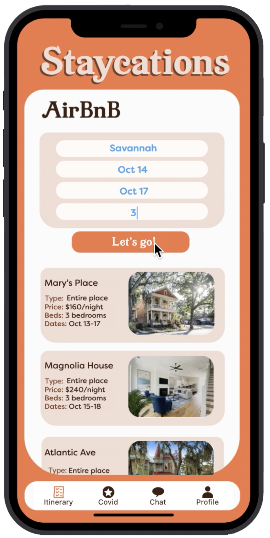 The thematic treatment of this app utilizes bright, warm hues similar to AirBnB’s branding standards as well as a newer look to signify the difference of the times of this service. The typography and rounded rectangles aim to evoke adventurous bookings and enthusiasm for local travel. While the focus is on the data and function of the app, the design treatment follows its purpose.
